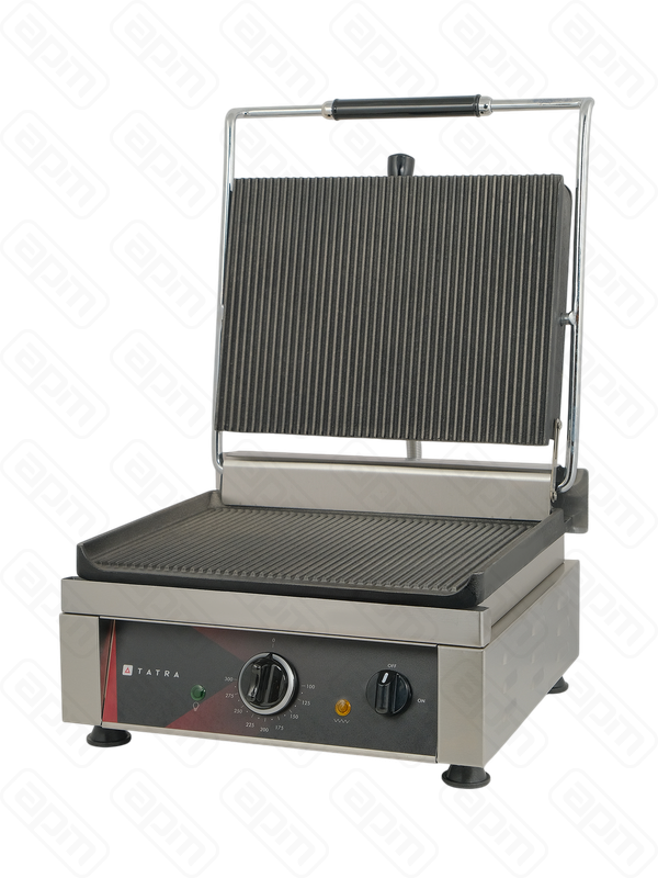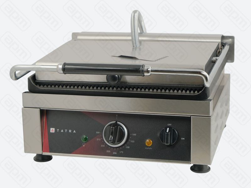 Прижимной гриль Tatra TCG 3627 RR предназначен для профессиональной жарки мяса, птицы, рыбы, овощей и разогрева полуфабрикатов на предприятиях общепита и торговли. Модель оснащена удобной электромеханической панелью управления с терморегулятором и индикаторной системой контроля состояния устройства, включая питание и нагрев. Для удобства эксплуатации предусмотрена ёмкость для сбора жира. Материал корпуса — нержавеющая сталь.