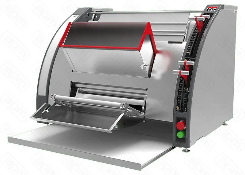 Модель превращается из формовочной машины в раскаточную при открытии переднего выводного конвейера для выхода плоских типов изделий.