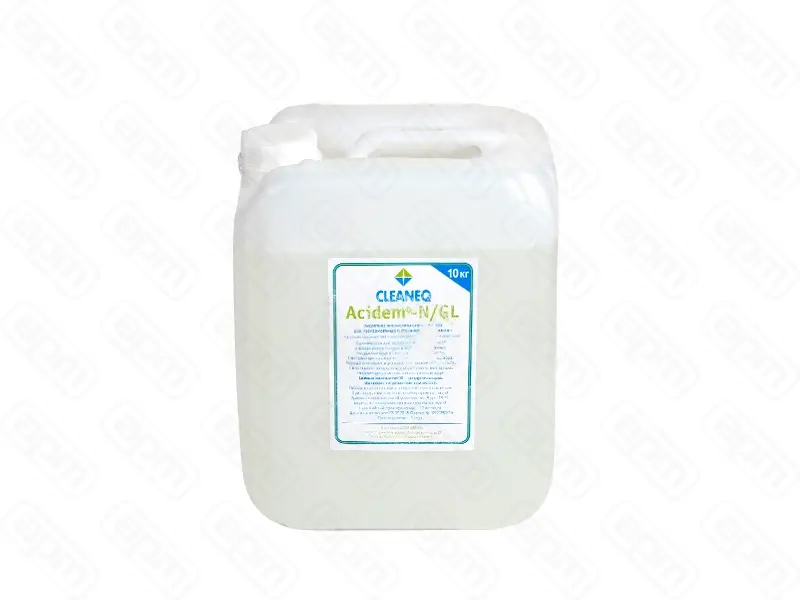 Жидкое кислотное моющее средство (ополаскиватель) т.м.CLEANEQ серии Acidem N/GL для посудомоечных и стаканомоечных машин, 10 кг. На основе неионогенных ПАВ и консервантов ТУ 2381-001-53208249-2002. Применяется для ополаскивания стеклянной и фарфоровой посуды в автоматизированных посудомоечных и стаканомоечных машинах. Нейтрализует остатки моющего щелочного раствора. Хорошо смачивает и ускоряет высыхание поверхности. Не оставляет разводов и придает блеск. Без запаха. Рекомендуется использовать в мягкой воде. Рабочая концентрация: 0,2 – 0,5 мл/л. при емпературе: + 20 – 350С.Символ опасности - Xi (раздражающий). Вызывает раздражение слизистых. Работать со средством в защитных перчатках, очках. При попадании в глаза и на кожу промыть водой. Хранить в оригинальной упаковке от –5 до +25°С. Беречь от солнечных лучей. Гарантийный срок хранения – 12 месяцев. Срок годности – 3 года. Вес нетто 10 кг. Упаковка: канистра 10 дм3