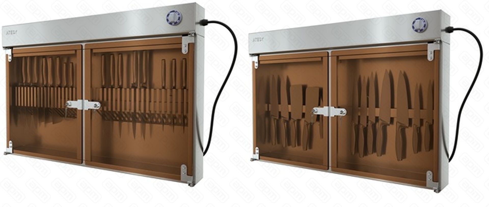 - Корпус изготовлен из нержавеющей стали AISI 430 - Возможность крепления к стене - Двери камер изготовлены из тонированного стекла, обеспечивающего защиту персонала от ультрафиолетового излучения - Двери оснащены замками - Легкосъемные держатели изготовлены из нержавеющей стали - Оснащен таймерами - Оснащен устройством автоматического отключения работы лампы при открывании двери - Максимальная длина ручки: 14 см - Максимальная длина лезвия: 28 см - Ширина каждой ячейки: 9 мм - Средний срок службы лампы: 5000 часов