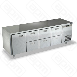 — Столешница и корпус из нержавеющей стали марки AISI 430 — Задняя панель из оцинкованной стали — Полезный объем стола: 276 л — Направляющие с доводчиками (Австрия) — Нагрузка на ящик: 35 кг — Компрессор (Испания) — Петля доводчик (Польша) — Нога опорная круглая, регулировка 50 мм (Италия) — Полка решетка регулируемая по высоте с шагом - 45 мм, гастронормированная, нагрузка: 35 кг
