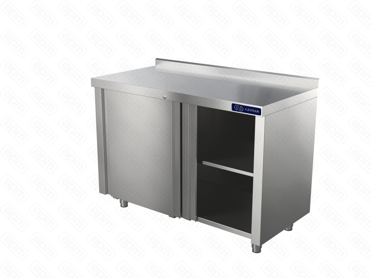 1100х600х870мм, 1 борт, нагрузка на столешницу 101кг, нагрузка на полку 49кг. Столешница нерж. сталь AISI430 0,8мм, подложка столешницы ДСП 16мм. 2 двери купе. Двери, боковые панели и столешница выполнены из нержавеющей стали AISI430. Дно и задняя стенка выполнены из оцинкованной стали. В комплект стола входит полка, усиленная ребром жесткости. Наличие полки позволяет увеличить полезное пространство в столе размещая на ней посуду, инвентарь, столовые приборы и сухие виды продуктов. Регулируемые ножки 20мм. Вес 56,8кг.