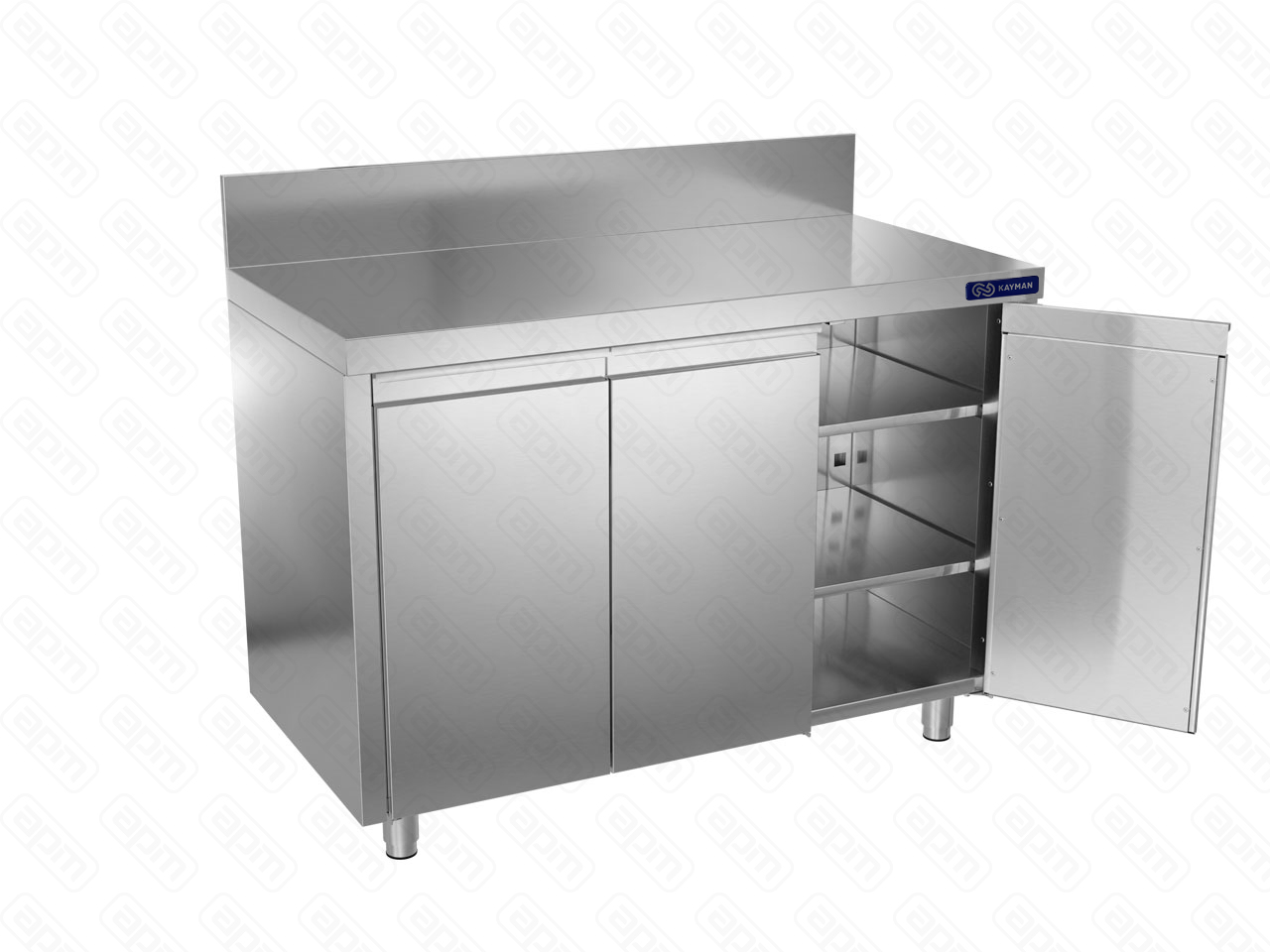 1300х600х870мм, 1 борт, высота борта 150мм, нагрузка на столешницу 100кг, нагрузка на полку 30кг. Столешница нерж. сталь AISI430 0,8мм, подложка столешницы ДСП 16мм. 3 распашные двери. Двери, боковые панели и столешница выполнены из нержавеющей стали AISI430. Дно и задняя стенка выполнены из оцинкованной стали. В комплект стола входят 2 полки, усиленные ребром жесткости. Наличие полки позволяет увеличить полезное пространство в столе размещая на ней посуду, инвентарь, столовые приборы и сухие виды продуктов. Регулируемые ножки 20мм. Вес 80кг.
