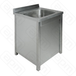 Данная модель ванны укомплектована четырьмя регулируемыми по высоте ножками и шкафчиком для хранения моющих средств или кухонного инвентаря. Дверка шкафчика, как и весь каркас, выполнена из нержавеющей сталиAISI 304.