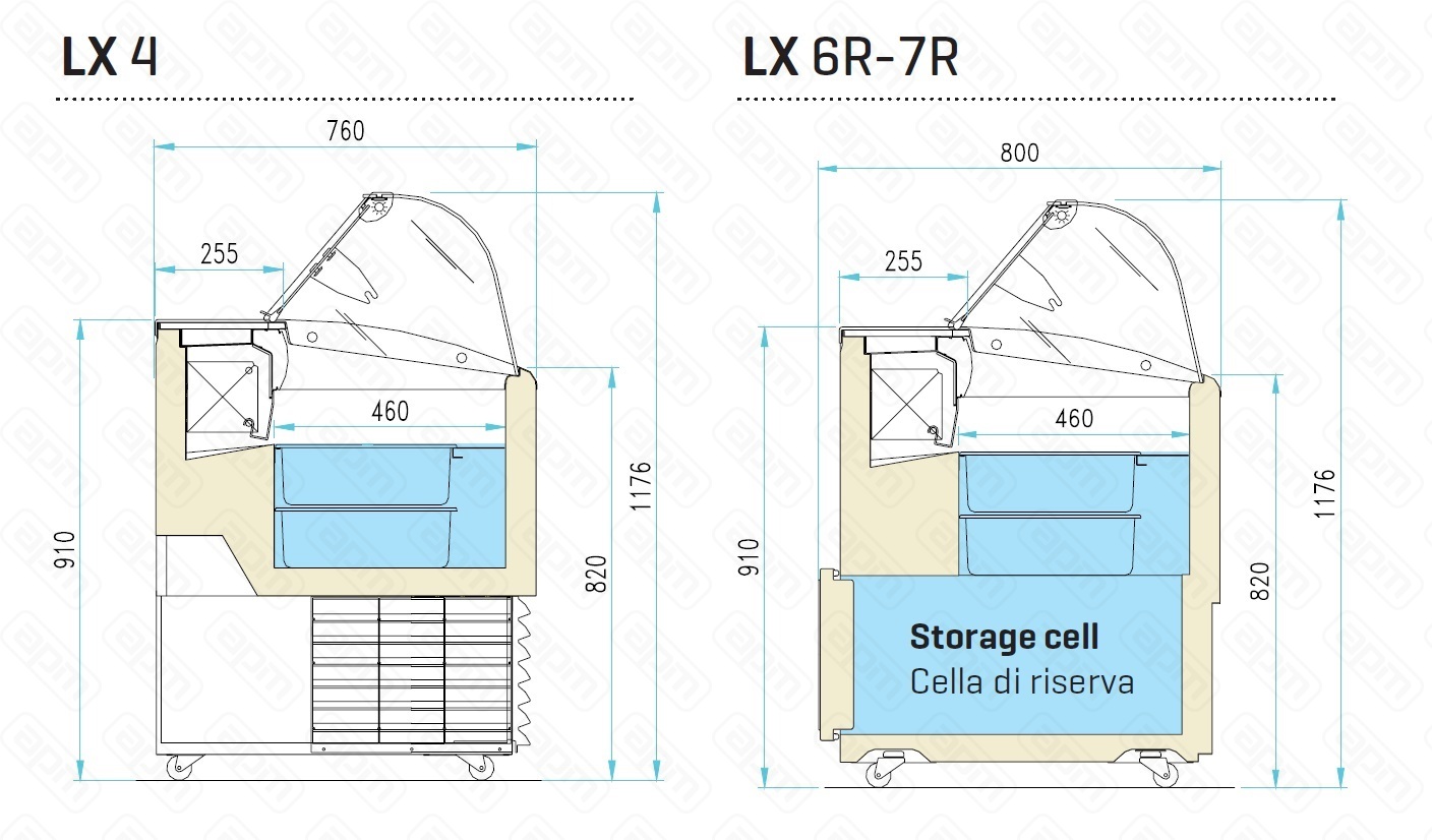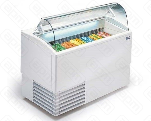 1184x800x1176мм, 0,81кВт, 220В, 97 кг. Цвет отделки Белый, вместимость 6(+6) емкости по 5 л (360х165х120 мм), резервный отсек для хранения запаса, температурный дипазон -20...-10C. Стеклянная надстройка с гнутым стеклом, поворотная крышка-дверца, охлаждение статическое, автоматическая оттайка. Климатический класс 7 (Т до 35C, влажность до 75%), хладагент R290